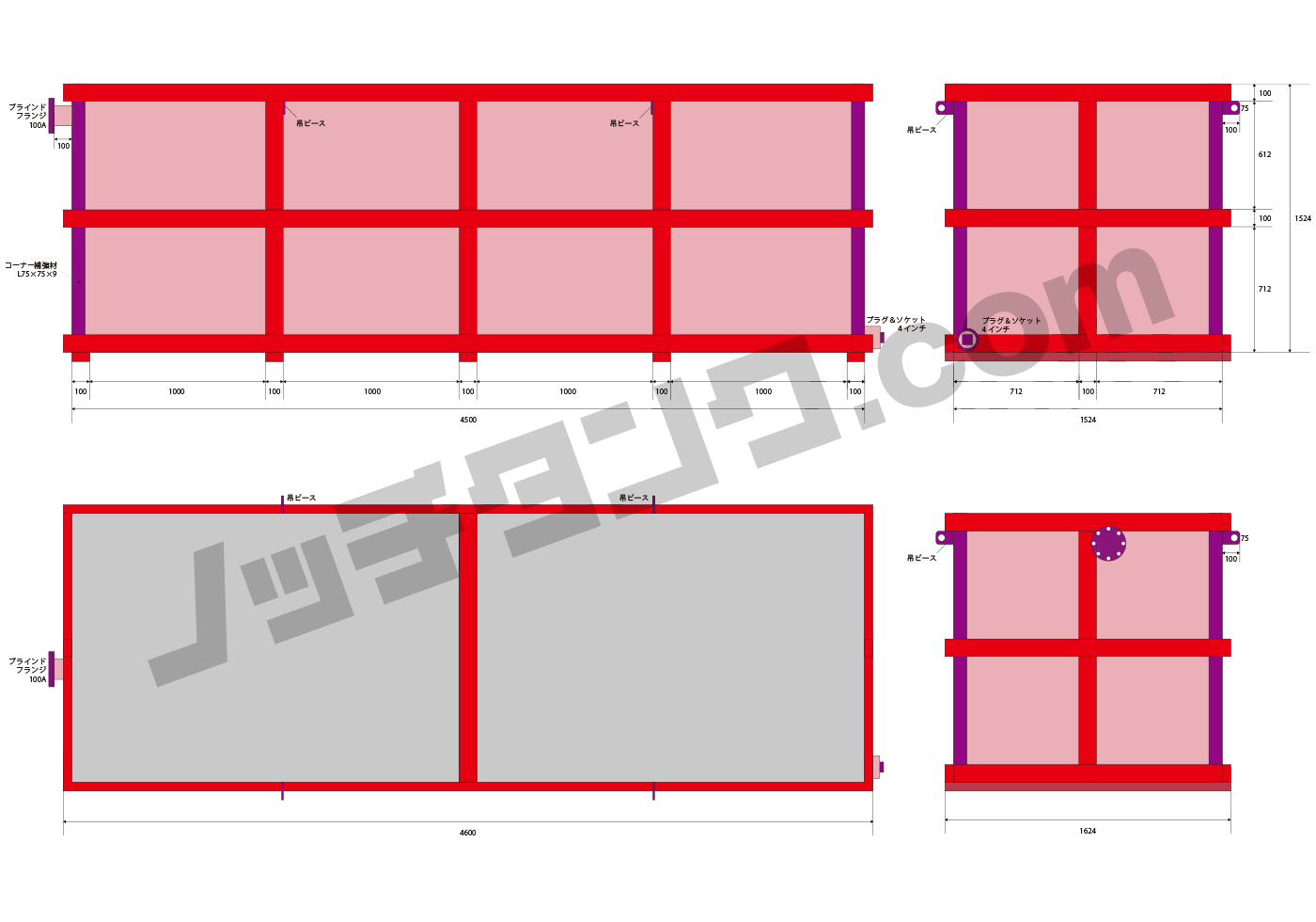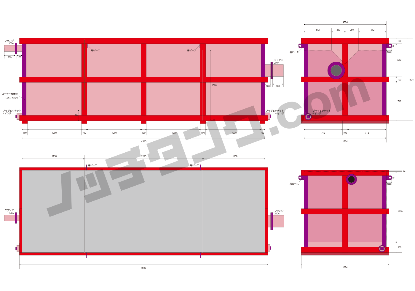 外寸( mm ):全長( L ) 4,600 × 全幅( W ) 1,624 × 全高( H ) 1,574 ※給排水管・吊ピース部分を除く 内寸( mm ):全長( L ) 4,500 × 全幅( W ) 1,524 × 全高( H ) 1,524 容積:10.4㎥ / 重量:約1,540kg |