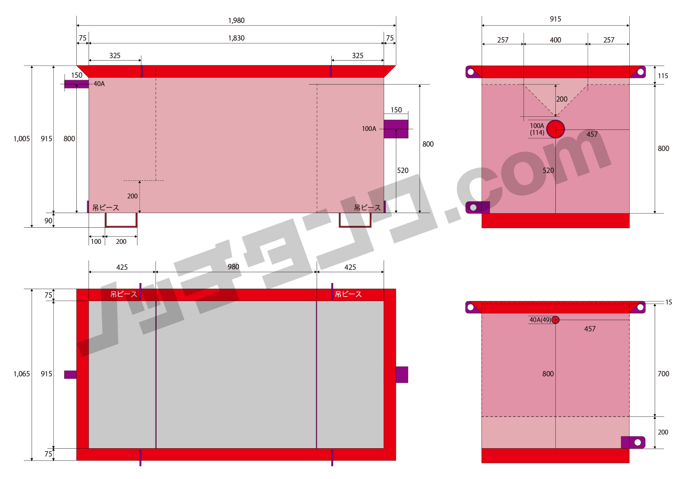 外寸( mm ):全長( L ) 1,980 × 全幅( W ) 1,065 × 全高( H ) 1,005 ※給排水管・吊ピース部分を除く 内寸( mm ):全長( L ) 1,828 × 全幅( W ) 914 × 全高( H ) 914 容積:1.5㎥ / 重量:約350kg |