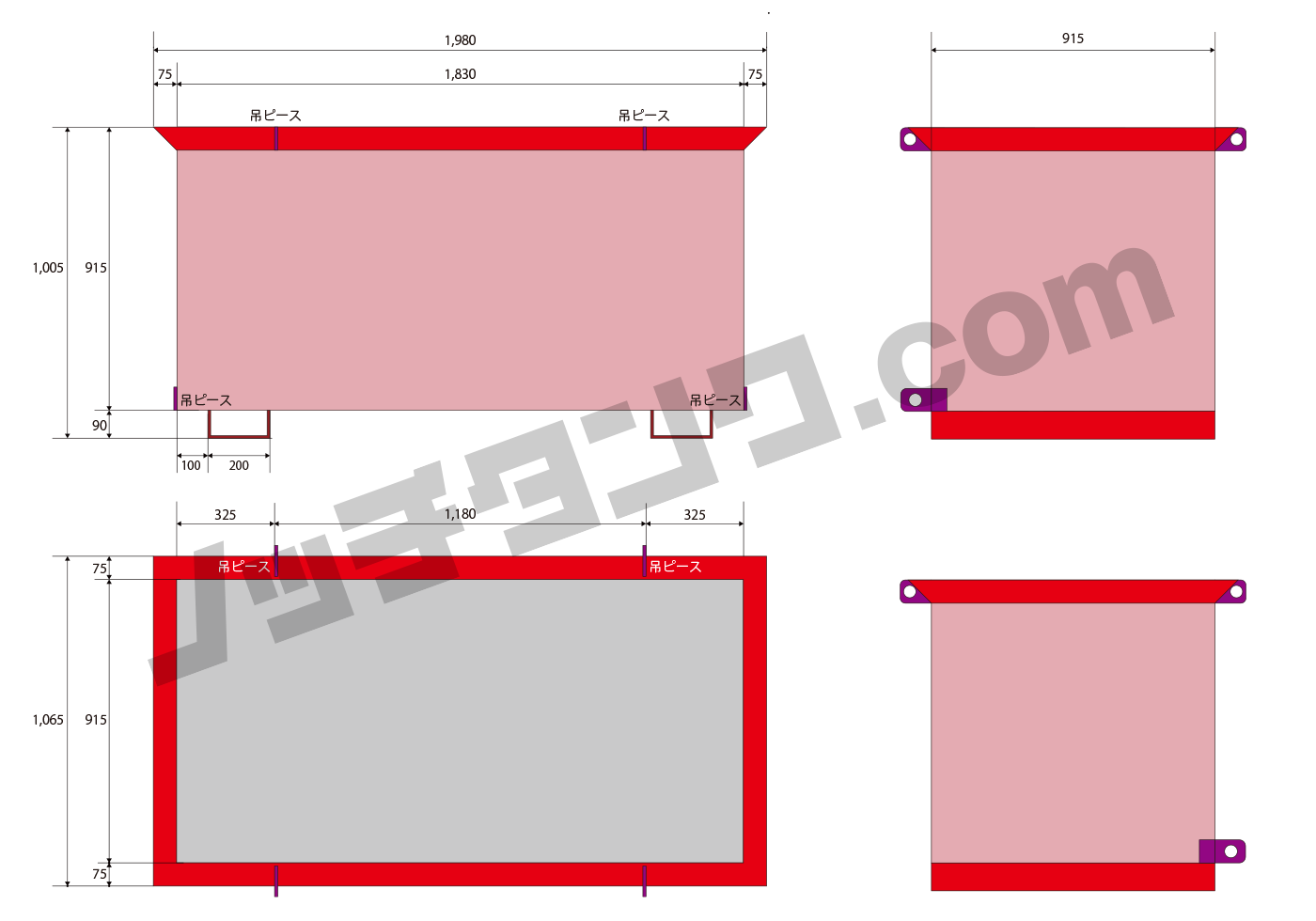 外寸( mm ):全長( L ) 1,980 × 全幅( W ) 1,065 × 全高( H ) 1,005 ※給排水管・吊ピース部分を除く 内寸( mm ):全長( L ) 1,828 × 全幅( W ) 914 × 全高( H ) 914 容積:1.5㎥ / 重量:約390kg |
